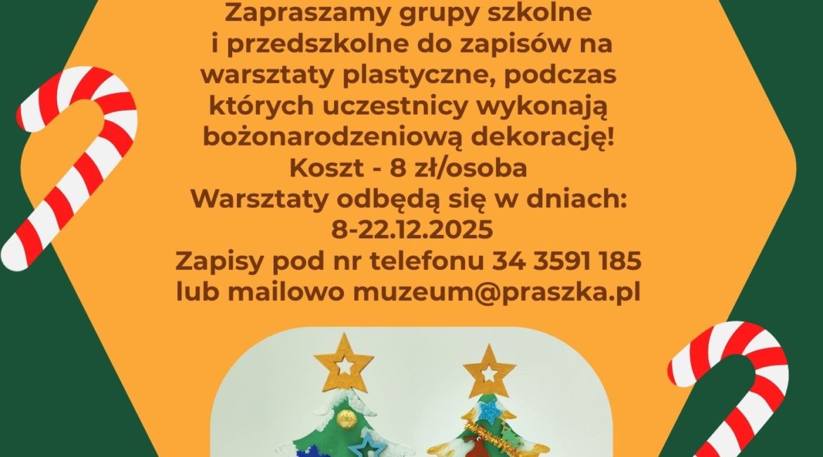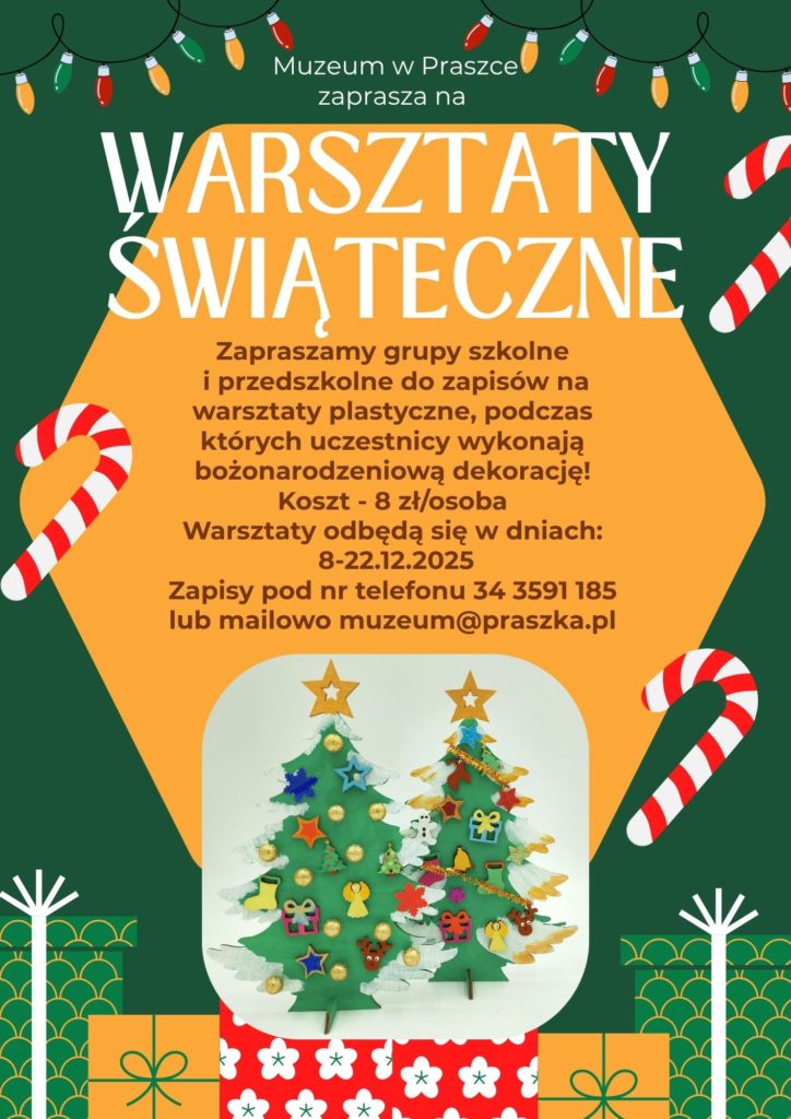 WARSZTATY ŚWIĄTECZNE Warsztaty bożonarodzeniowe! Serdecznie zapraszamy na warsztaty plastyczne podczas których wspólnie wykonamy bożonarodzeniową dekorację! Zapewniamy wszystkie materiały i świąteczną atmosferę Szczegóły na plakacie. Zapraszamy!